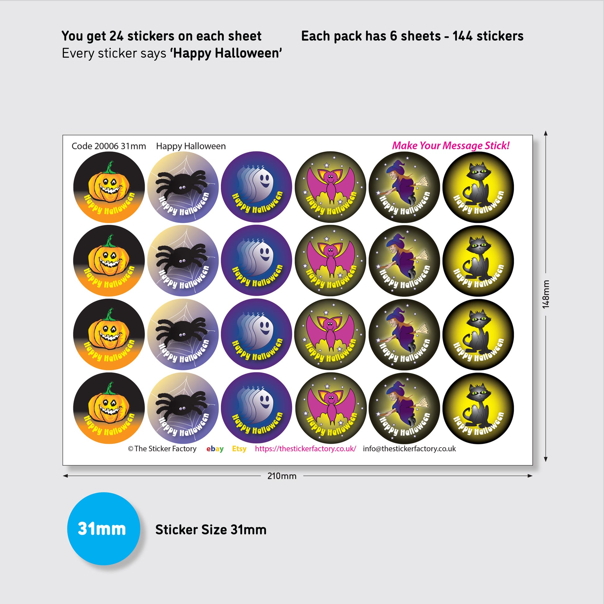 A fun set of 144 mixed 'Happy Halloween' with slightly scary but also cute stickers designed for children's parties, schools, and teachers. Each sticker features a Halloween theme and comes in a vibrant multicoloured design. The stickers are permanent and come in 6 sheets, making them ideal for decorating any room or as rewards for students. Made in the United Kingdom, these stickers are a fun and creative way to add a touch of Halloween spirit to any space.